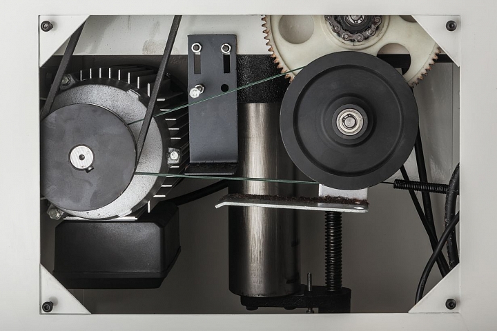 Фугование и рейсмусование производятся как обычно – каких-либо специальных приемов работы не требуется; переналадка почти не занимает времени. Верхний фуговальный модуль, объединяющий в себе оба стола и механизм регулировки глубины строгания, полностью откидывается (при этом ранее сделанные настройки не сбиваются), кожух стружкоудаления переворачивается. Компоновка с откидным верхом дает преимущества как в работе (лучше обзор, более качественно работает стружкоудаление), так и при обслуживании строгального вала, доступ к которому ничем не затруднен.