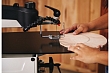 Станок оборудован параллелограммным механизмом привода качающейся части, имеющим ряд особенностей. Во-первых, верхняя часть рамы поднимается, что удобно при наладке или установке заготовки. В верхнем положении она фиксируется и не требует удерживания. Нижнее положение можно корректировать вращением рукоятки, подстраивая под длину пилки и толщину детали. Во-вторых, предусмотрен режим работы с продольной подкачкой полотна (так называемый маятниковый ход), который обеспечивает более «агрессивное» и производительное пиление. В зависимости от требований к скорости, точности и чистоте распила настраивают амплитуду продольных движений в диапазоне от нуля и до максимальной величины. Процедура выполняется поворотом моторного модуля вокруг оси.
